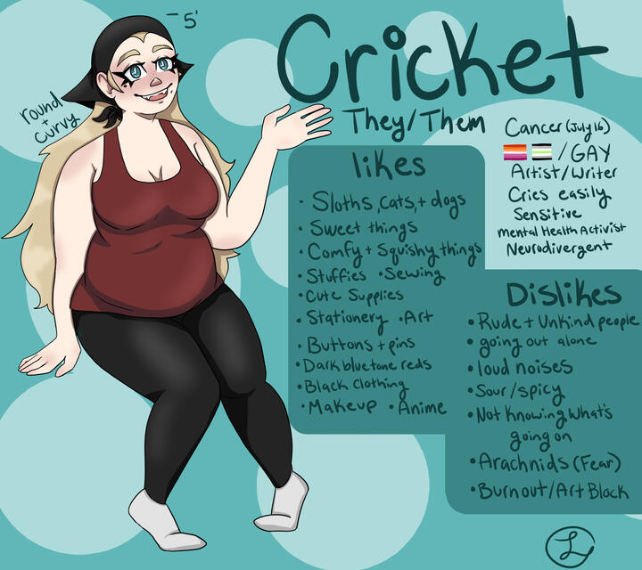 Hiya friends!My name is Cricket, but I also go by Cricky! I am a queer disabled writer and artist trying to make it through the big world! Nowadays, I mostly write for the enjoyment of others and myself, but I do plenty of art in all different types when I can. My main mediums are digital art and traditional sketch with the occasional pen/colored pencil/marker or watercolor! I also find joy in making costumes and cosplays. Makeup is an art, too!I’m a cancer sun, and I love animals like sloths, cats and dogs! I am not only all about disabled rights, but I am also about mental health rights seeing as both of those things majorly affect me! Human and animal rights are something I take seriously and believe in 100%.I am still living in my over 10-year strong hyperfixation of Five Nights at Freddy’s and specifically have taken a very large liking to its newer game Security Breach. I am an enjoyer of clowns and jesters, and making characters and worlds gives me life!I live in the Midwest in the central time zone, so if you are ever looking to get a hold of me, take a peek at my time. I’m always open to questions if you have any!